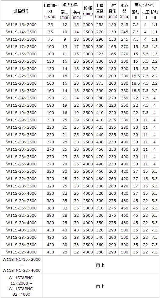 ★制品精度超群:由于连续弯曲,以及高精度的端部预弯,从而得到精度超群的制品,另外上辊呈鼓形状,托辊配合调节,从薄板到厚板这一广泛的范围内能够卷制理想的产品。★不同的用途相应的控制方法:根据用途,有以下控制方法:TNC(上NC),多品种小量生产。T&BNC(上下NC),少品种大量生产用。CNC(CNC),多品种大量生产用。★CNC控制高的生产效率:一人作业,操作简单,效率大幅度提高。★丰富的弯曲形状:具有卷制O型、U型、多段R等不同形状,其方式:O型弯曲:后方弯曲方式。U型弯曲:前方弯曲方式。特殊弯曲:组合式方式。中型上辊万能式卷板机技术参数: